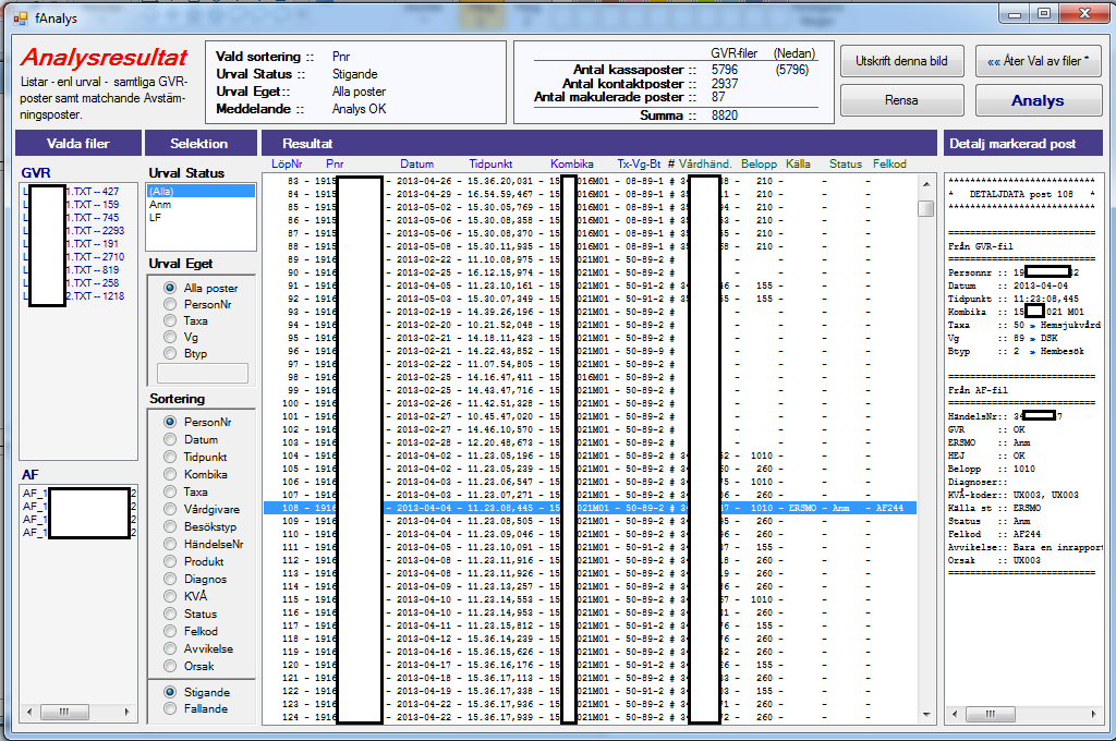 Analysreultat med stor möjlighet till Urval och sortering. Detaljinfo per post.